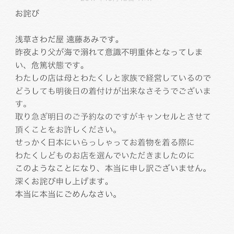 浅草さわだ屋 ミス浅草ジェニックエントリー受付中 11 18まで على تويتر お詫び 浅草さわだ屋 遠藤あみです 昨夜より父が海で溺れて発見され 意識不明重体となってしまい 現在も危篤状態です わたしの店は母とわたくしと家族で経営しているので どうしても明後日